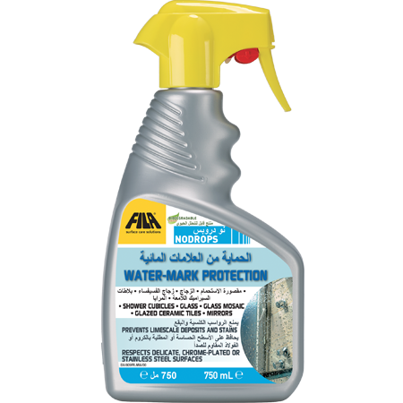 FILA NODROPS is cleans and protects glass surfaces making them hydrophilic, the water runs off without leaving limescale residues.