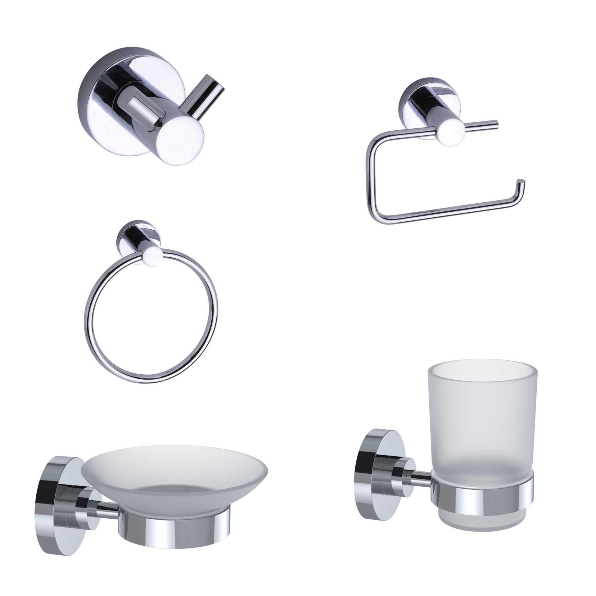 ARYA Accessories Set is a 5-piece bathroom accessories set are Soap Dish - Tumbler Holder - Toilet Paper Holder - Double Hook - Toilet Paper Holder - Round Towel Holder.